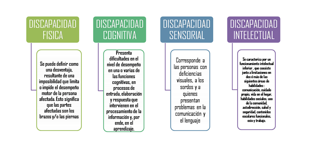 La discapacidad es un término general que abarca algunas limitaciones de actividad y restricciones a la participación diaria de la vida. Por ejemplo: parálisis cerebral, Síndrome de Down, depresiones… Las discapacidades afectan a las personas de maneras distinta, algunas pueden estar ocultas y otras tienen bastante visibilidad. Para que se entienda mejor los hemos agrupado en estos tipos: